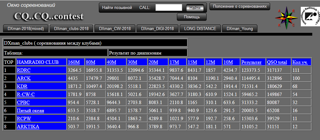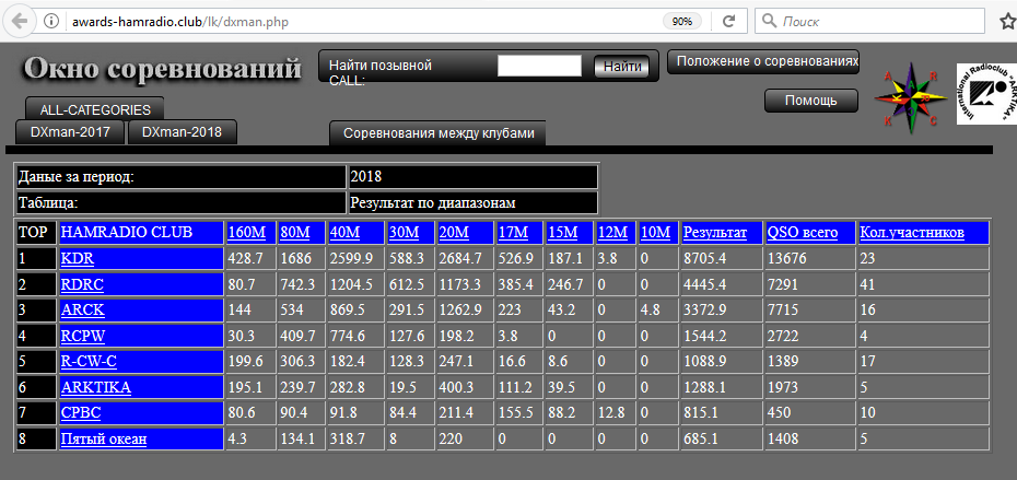 На сайте http://awards-hamradio.club/ идет некое соревнование между клубами. Наш клуб тоже участвует,мы пока на 2-м месте,несмотря на то,что участников почти в 2 раза больше,чем у КДР-цев. Из таблицы видно,что они нас обходят по НЧ диапазонам. Кто работает на НЧ,особенно 160 и 80 м,можно там зарегистрироваться и помочь клубу в повышении своего рейтинга на этом ресурсе :). Кроме того,там можно выполнить и скачать бесплатные дипломы в эл.виде и заказать плакетки.