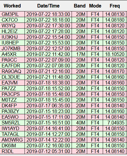 Поработал недельку в ФТ4 и был приятно удивлён, нет массового наплыва, много станций, работают и лисой, нет помех, связь короче чем в ФТ8 в два раза. Работал на 40 и 20 метрах, на 80 и 30 метрах пока ни кого не слышу. На 144 мгц не проверял. И есть подтверждения в хамлоге. На карточках указано MFSK, а в скобках мода ФТ4. QSL отсылают сразу на е-маил, видать это новшество или от кого то приняли такой способ рассылки карточек в электронном виде.