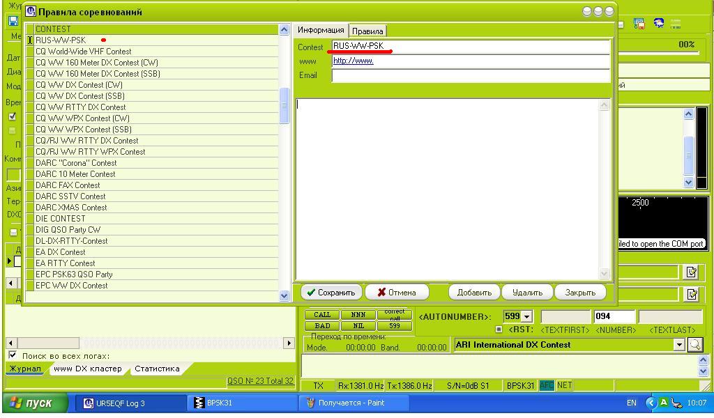 Внизу у верхнего края передающего окна прописано название какого-то теста. Не важно. Справа от надписи имеется флажок и лупа. Жмем лупу. Появится окно "Правила соревнований" Состоит из 2 половинок. В левой перечислены тесты, а правая для настройки. Причем правя тоже из 2 закладок. Заполняем в закладке Информация строку Contest. Можно и остальное заполнить, а можно остальное оставить пустыми.