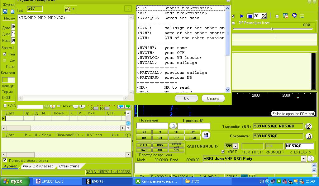 По 1. У меня макрос №8 AGN. Его содержимое, которое летит в эфир, у меня NR? NR? NR?. Все понимают и повторяют контрольный номер (хоть область, хоть номер, хоть локатор). Кстати, там можно написать AGN? AGN?. Тоже понимают.