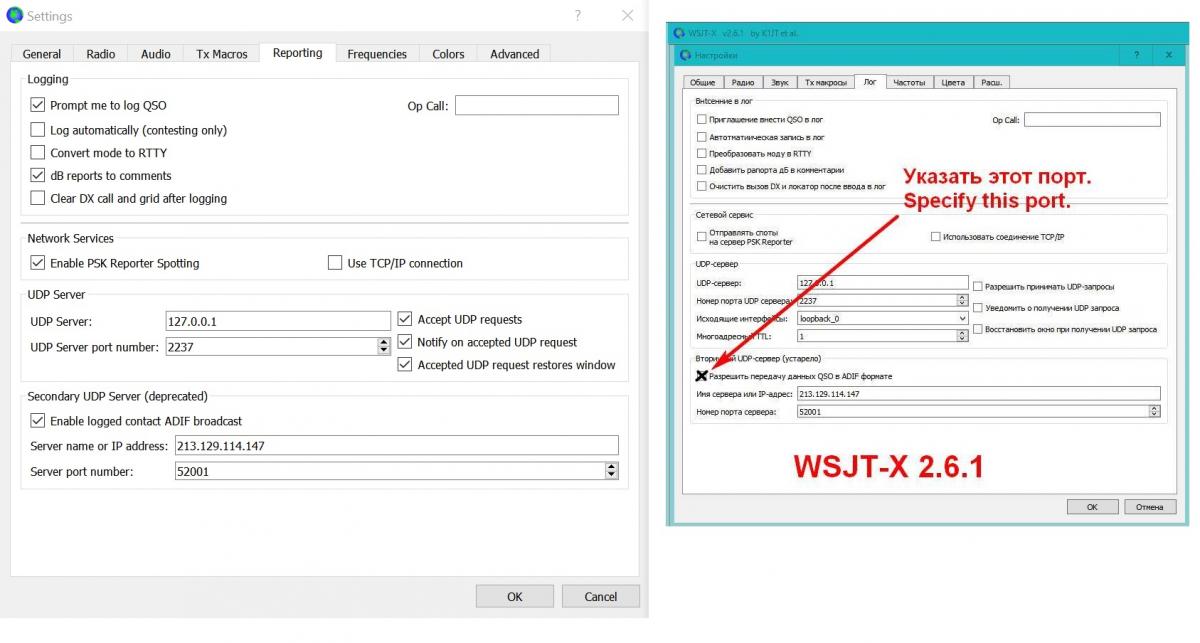 В настройках WSJT-X v2.7.0 в Settings -> Reporting -> Secondary UDP server указал 213.129.114.147 port 52001 в соответствии с инструкциями на https://udp.rdrclub.ru/help/