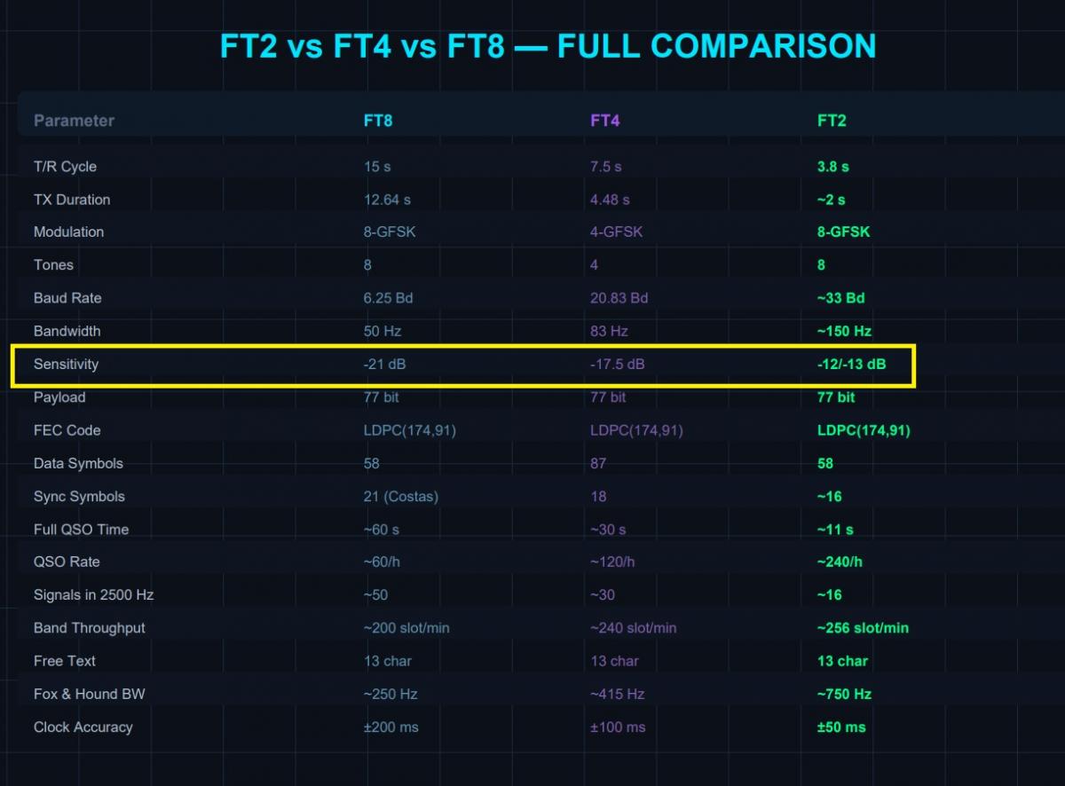 График времени против пропускной способности и чувствительности показывает инженерный компромисс по отношению к FT2: при 3,8 секунде при полосы пропускания 150 Гц чувствительность составляет примерно -12/-13 дБ. Менее чувствительный, чем FT8, но более чем достаточный для конкурсов, DXpeditions и навалок с сильными сигналами.