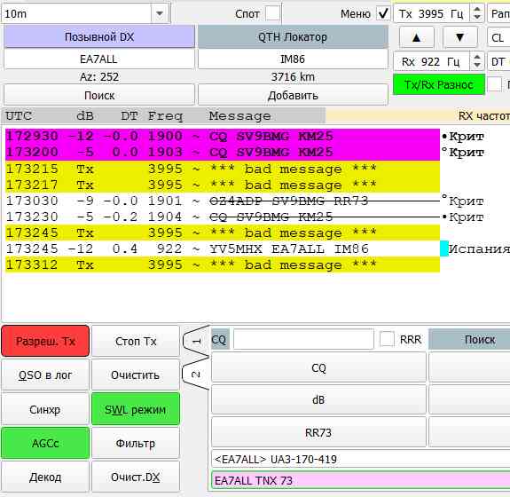 Если её не погасить соседней кнопкой "Стоп TX", то двойной клик по следующему позывному вызывает зуммер и появляется знакомый текст "*** bad message ***". Но передача вроде бы не активируется.