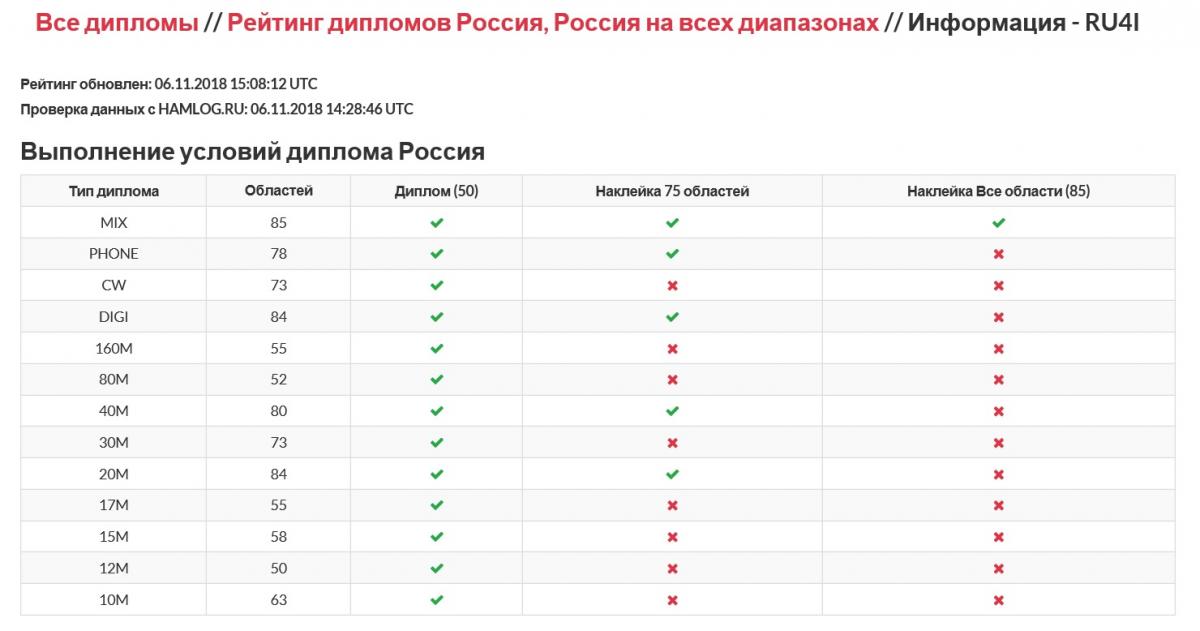 Некое предварительное мерило работы антенны... За неделю работы на новую антенну выполнил базовые дипломы "Россия" на 160м и 80м.