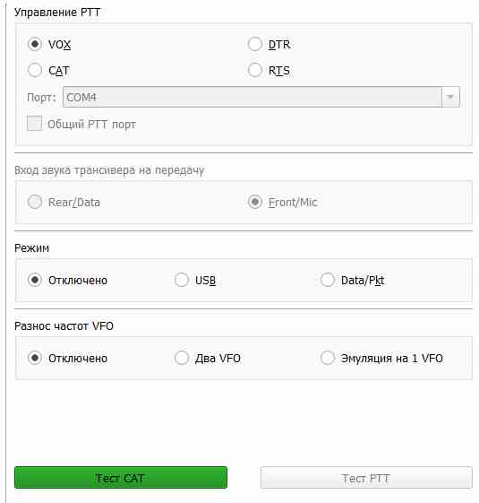 Теперь у меня "Управление PTT" - "VOX". Остальные переключатели в этой части закладки "Радио" (Режим и Разнос частот) - выкл.