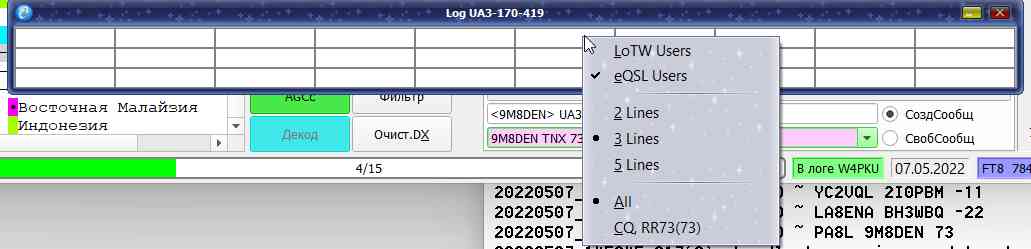 Вроде эти настройки и не помешали бы, потому что в главном окне у меня кнопка "АвтоTX" розовая (т.е. двойной клик на позывном не приводит к включению передачи).