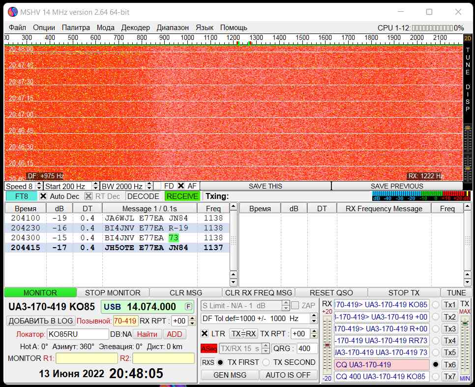 Моду практически не меняю: ft8. Однажды потратил какое-то время, постояв на ft4: принял буквально несколько QSO — и вернулся на ft8. Всё равно же все DIGI-моды считают за один вид (наш Клуб — исключение), а ft8 популярнее (IMHO).