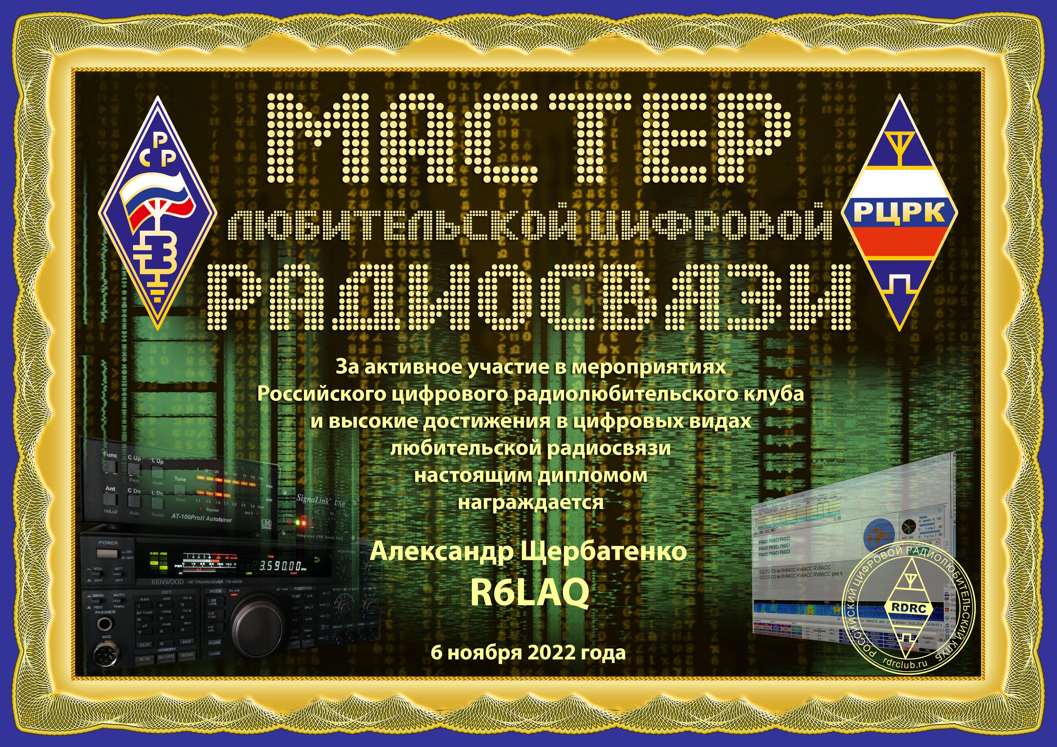 За проведение радиосвязей различными цифровыми видами при активном участие в днях активности, конкурсах и контестах РЦРК начиная с 1 января 2021 года диплом «Мастер любительской цифровой радиосвязи» выдаётся всем лицензированным радиолюбителям по новым правилам.
