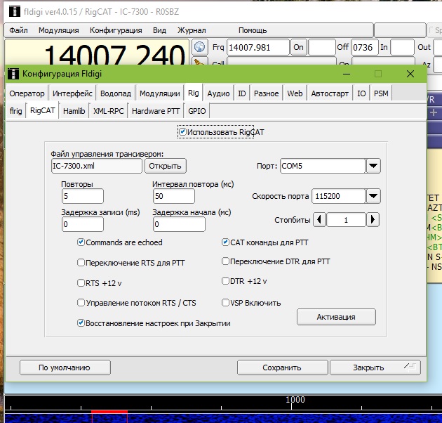 Настройки RIG контроля трансивером выставлены так:
