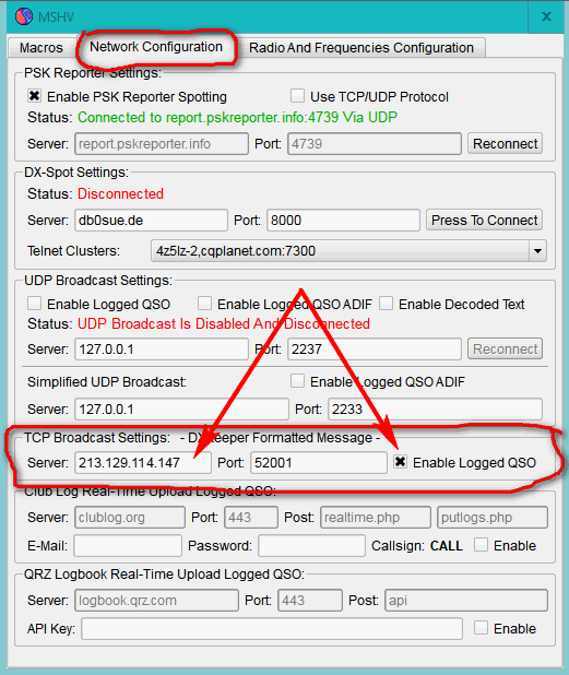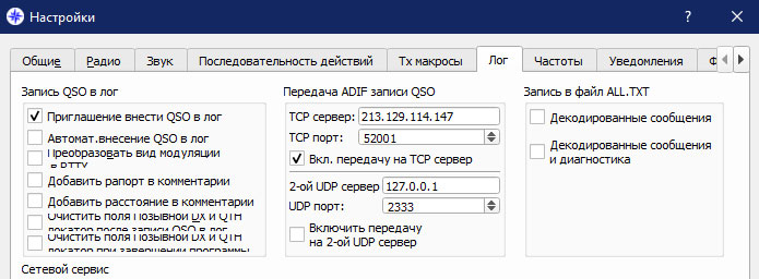 привожу картинку из JTDX - TCP прописываем в НАСТРОЙКАХ на вкладке ЛОГ