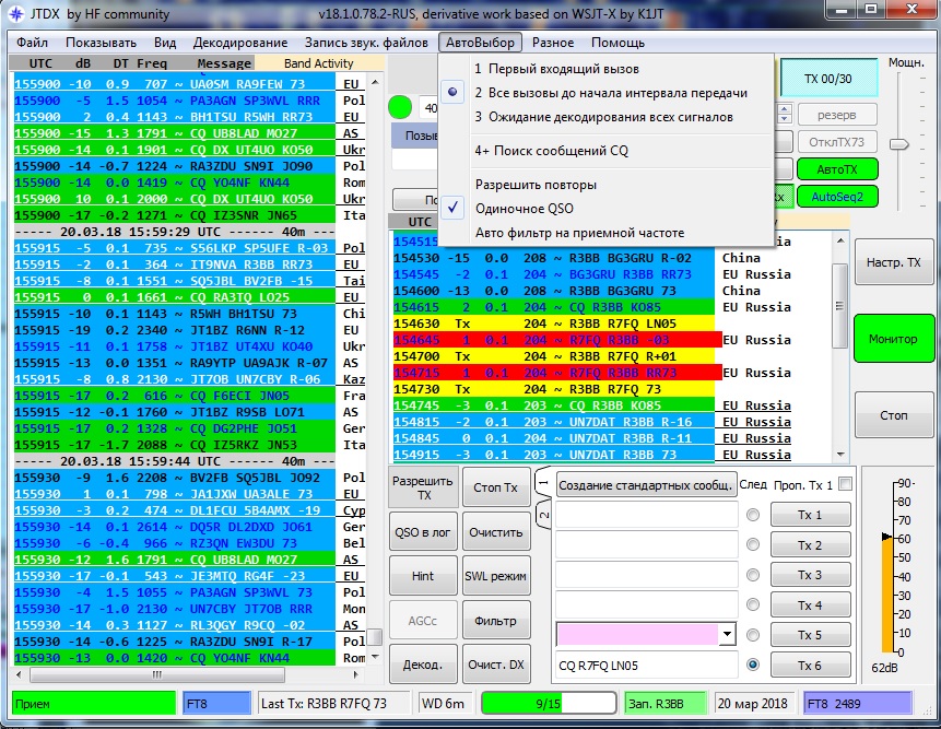 Давал CQ,станции вызывают ,а ПО автоматом не отвечает, хотя соответствующая кнопочка активна зеленым цветом,может единичный глюк...пока дальше не проверял, активировал ответ щелчком мыши...