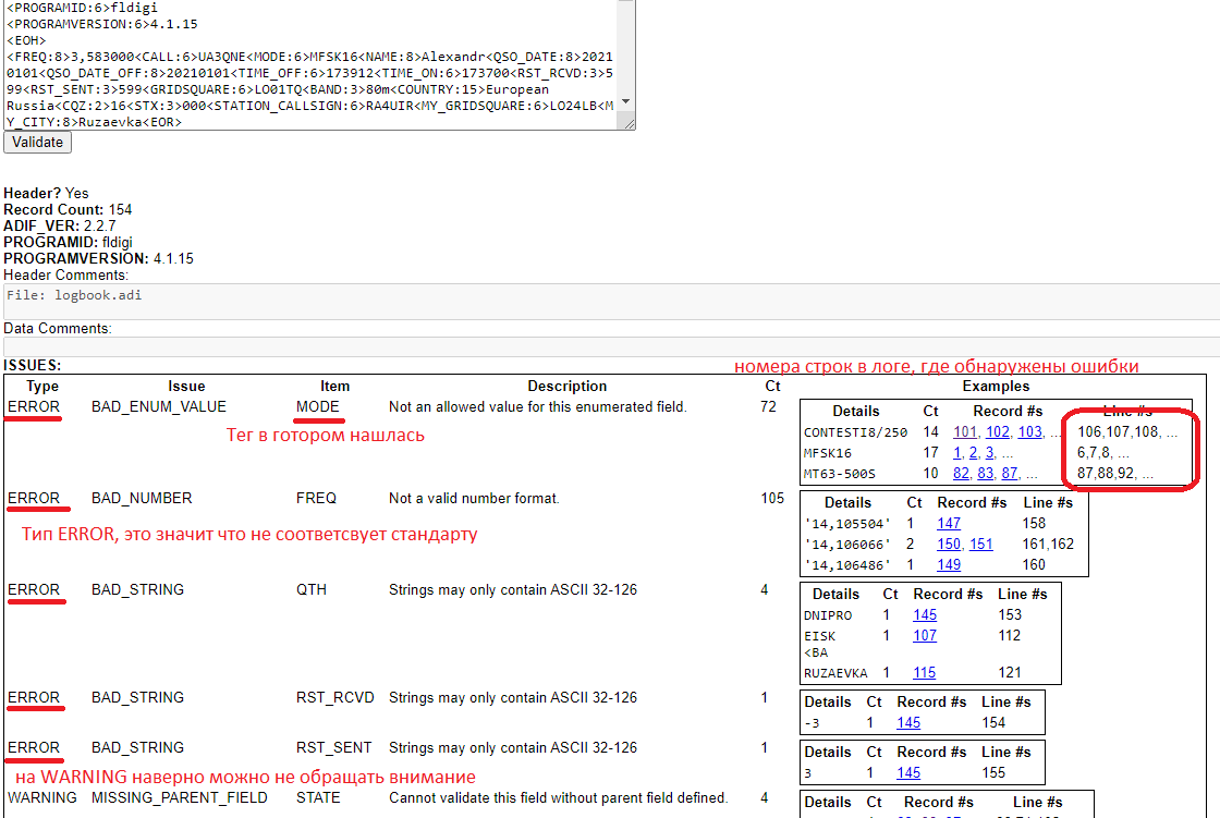 C разрешения Юрия RK3DSW, тут ссылку размещу, на валидатор adif. С помощью него можно проверить правильный ли лог файл.
