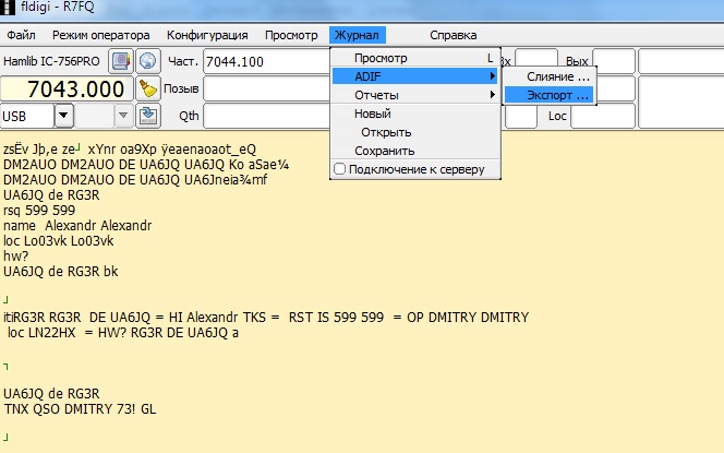 Logbook->Adif->Export дальше вроде интуитивно все должно быть понятным, если вопрос остался, то уточните, что не ясно