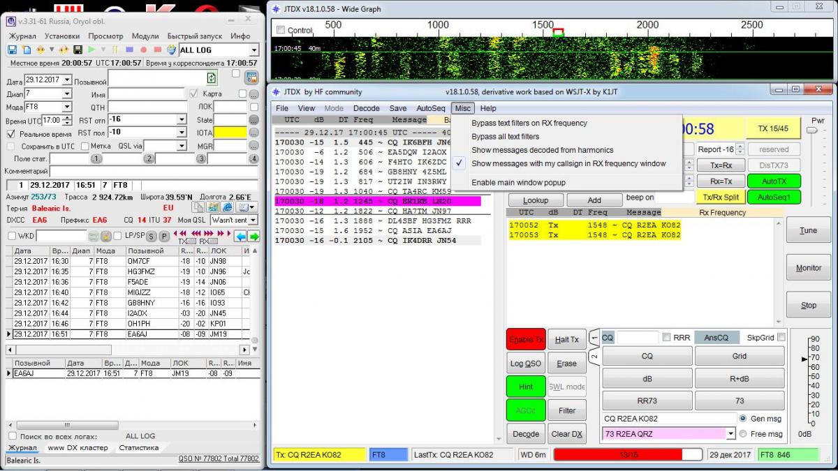 Хочу сказать автору проги JTDX Игорю огромное спасибо за " обкуренную программу" которая то декодирует, то не декодирует принятый сигнал, то по 15 раз передаёт одно и тоже итд . Можно свалить конечно вину на проход, антенны, трансивер, на оператора итд. Я уж и не рад, что связался с этой программой, одни проблемы ... автомат плохо работает ..зависает, одно и тоже передаёт ... прозевал, всё пошло по кругу дважды!