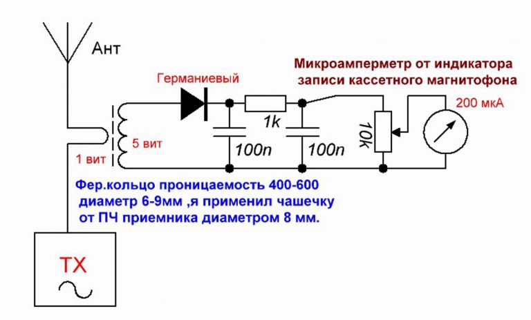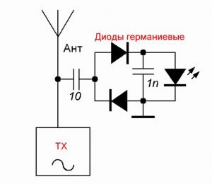 Еще одно полезное приспособление которое я использовал это индикатор тока в антенне .При использовании антенного тюнера или другого согласующего устройства можно использовать случайные антенны в вид куска провода произвольной длинны. Иногда удобнее при использовании низкоомных антенн измерять не напряжение в антенне а ток .Ниже схема простого индикатора тока в антенне.
