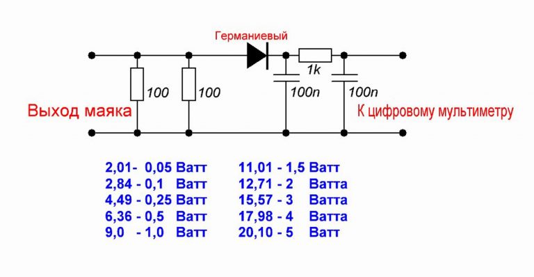 Измерить выходную мощность маяка можно с помощью простого измерителя мощности подключенного к цифровому мультиметру в режиме измерения напряжения . В таблице указано соответствие напряжения на нагрузке 50 Ом -выходной мощности.
