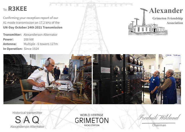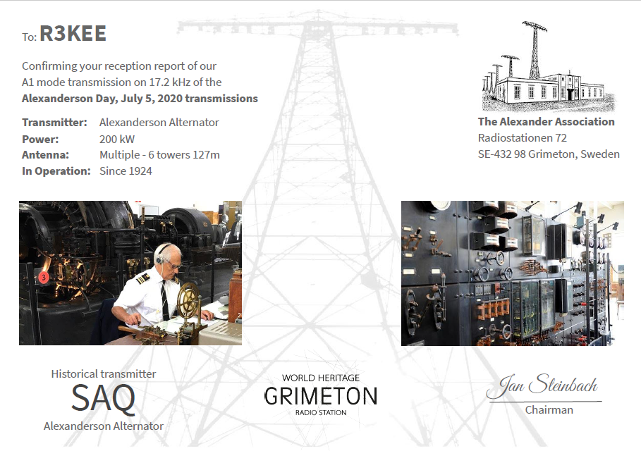 Ежегодная передача в Alexanderson Day шведского передатчика Grimeton на VLF 17,2 кГц с позывным SAQ состоится в воскресенье, 5 июля 2020 г.
