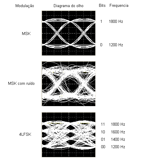 Для 4L-FSK используются частоты: '00' - 1200 Гц; '01' - 1400 Гц; '10' - 1600 Гц; '11' - 1800 Гц.