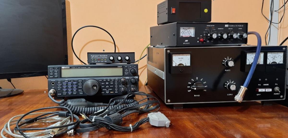 Трансивер Kenwood TS590S, интерфейс RigExpert Standart, кабельки для соединения интерфейса между компьютером и трансивером или напрямую по USB - USB, УМ на 4 ГУ-50, КСВ-метр и ручной тюнер MFJ-941E. Компьютер и ноутбук.