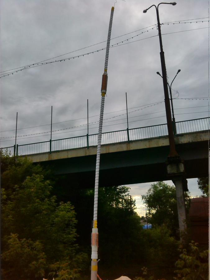 Проверил собранную конструкцию, минимальная частота настройки составляла 16 МГц, то есть на 20 метровый диапазон я не попадал. Попробовал вместо верхнего штыря взять провод подлиннее и навить его на верхнюю часть трубы. Под рукой оказался кусок провода и я его полностью намотал на трубу, порядка 30-40 см. не уместились на трубе, но решил их пока не резать, чтобы потом добавлять не пришлось.