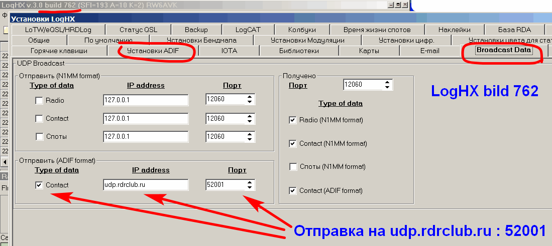 Начиная с версии LogHX3Setup_build_699 в Setup -> General Setup -> Broadcast Data появился прием и занесение в лог QSO по сети (либо localhost). В меню Setup -> Net setup проверить/удалить не нужные установки. Если LogHX используется на другом компьютере (или в качестве сервера), то в настройках N1MM следует указывать IP адрес, где работает LogHX. QSO появляется в LogHX сразу после занесения QSO в лог N1MM. Эти настройки работают только для N1MM -> LogHX.