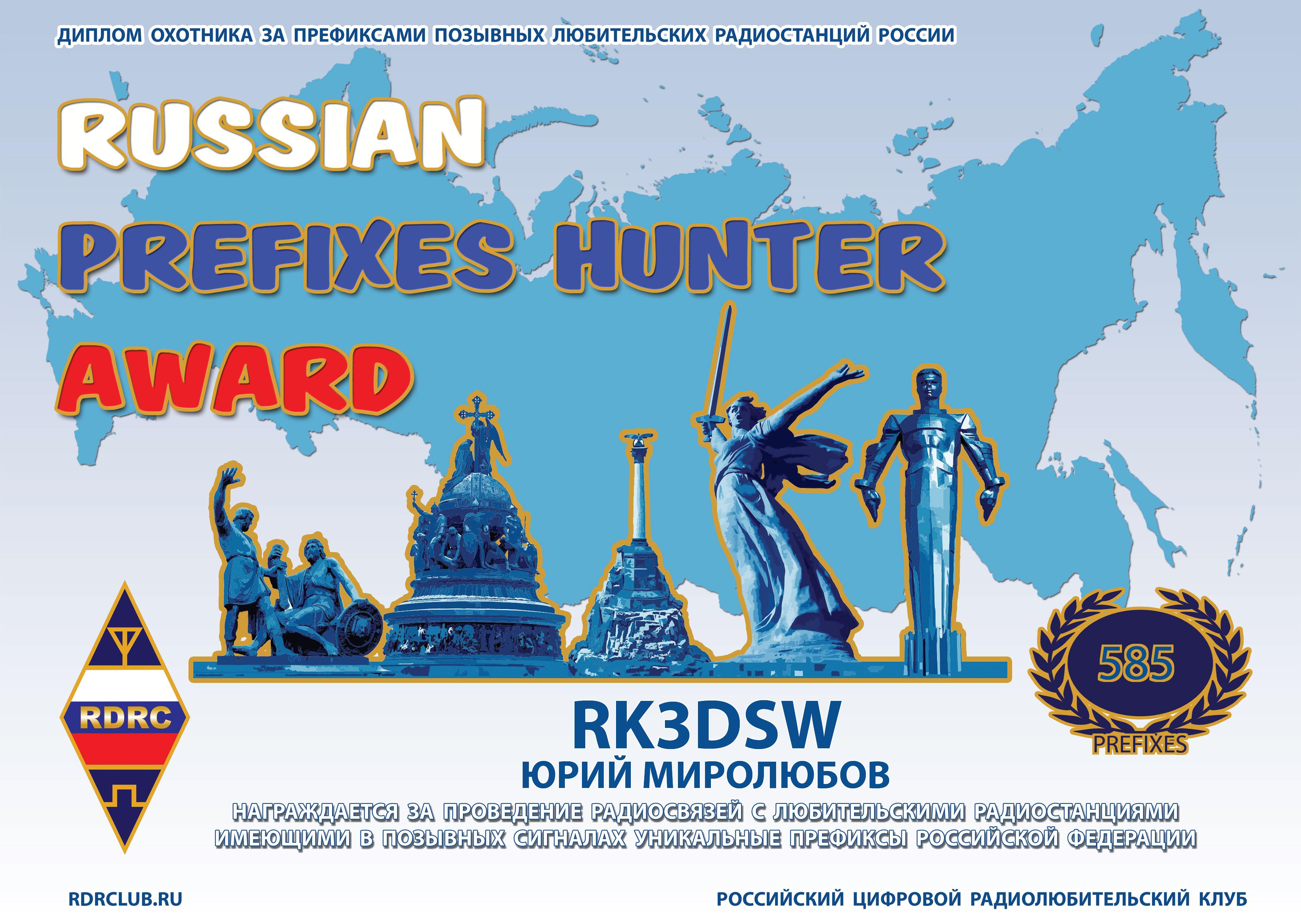 Диплом охотника за префиксами позывных любительских радиостанций России - Russian Prefixes Hunter AWARD учреждён клубом РЦРК и выдаётся соискателям на сайте наград РЦРК за радиосвязи с любительскими радиостанциями, имеющими в позывных сигналах уникальные префиксы любительских радиостанций России. Засчитываются все префиксы начинающиеся на букву R, префиксы из серии UA-UI, а также D1 и D0. Для примера показываем как определяются префиксы в следующих позывных: R2DSY, RW6AVK, R2015NY и т.п.