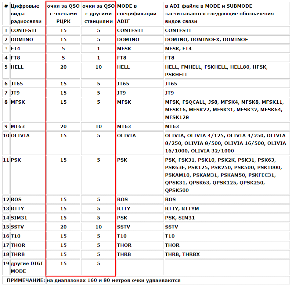 Для розыгрыша призов результаты участников будут распределены по 10 подгруппам. В этих подгруппах мы разыграем в лотерею 10 персональных призов с эмблемой РЦРК и позывным участника (по одному в каждой подгруппе) среди членов клуба, которые проведут радиосвязи (наблюдения) не менее чем в 10 цифровых видах (ниже смотрите таблицу MODE цифровых видов).