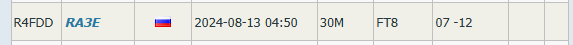 Ответочка от корреспондента:Код:2024-08-13 07:49:44 -- 188.116.153.135 : 51953 -- : <BAND:3>30m <CALL:5>R4FDD <FREQ:9>10.136894 <MODE:3>FT8 <QSO_DATE:8>20240813 <TIME_ON:6>044900 <RST_SENT:3>-12 <RST_RCVD:3>+07 <TX_PWR:0> <GRIDSQUARE:4>LO33 <EOR> : end 2024-08-13 07:49:44 -- OLD software version. Break