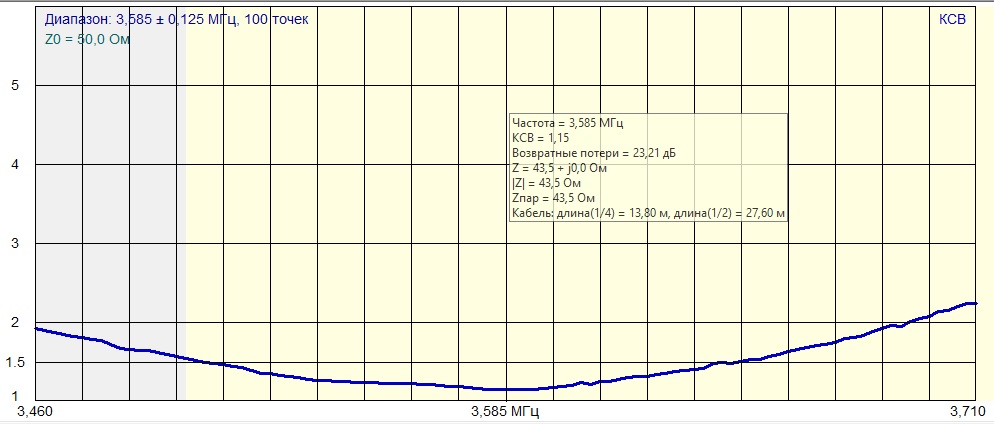КСВ настроил ближе к цифровому участку, но можно работать CW и SSB, понятно,что весь 80-ти метровый диапазоне антенна без переключений в СУ не перекрывает.