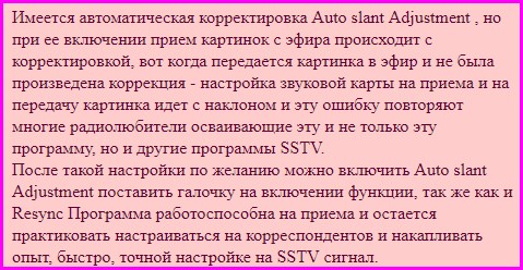 В процессе работы в эфире возникает ситуация, чтоб запустить программу на прием вручную для этого, имеется вертикальный ряд кнопок с надпись формата SSTV-RXMode, но необходимо знать в каком формате передается картинка, в Европе применяют формат Martin 1 (114 sec) и реже Martin 2 (58 sec) и в остальных странах используют Scottie 1 (110 sec) при нажатии соответствующей кнопки - включается прием, ( при нажатии правой кнопки появляется список 37 форматов SSTV заложенных в программу), но при это не будет синхронизирована картинка из за не точно настройки на сигнал SSTV и можно попытаться использовать повторную синхронизацию - курсор переместить на поле экрана, где рисуется картинка построчно, правой кнопкой мышки вызываем меню и левой кнопкой активизируем кнопку ReSync - (в версии 1.06 -выведено на панель RX) обычно этим пользоваться при слабых сигналах на фоне шума, когда программа не может автоматически определить формат и запуститься на прием, даже если у вас установлен режим на включении программы при очень слабом SSTV сигнале ( Setup MMSSTV в окне RX в режиме Squelch levels - включен - Lowerst )