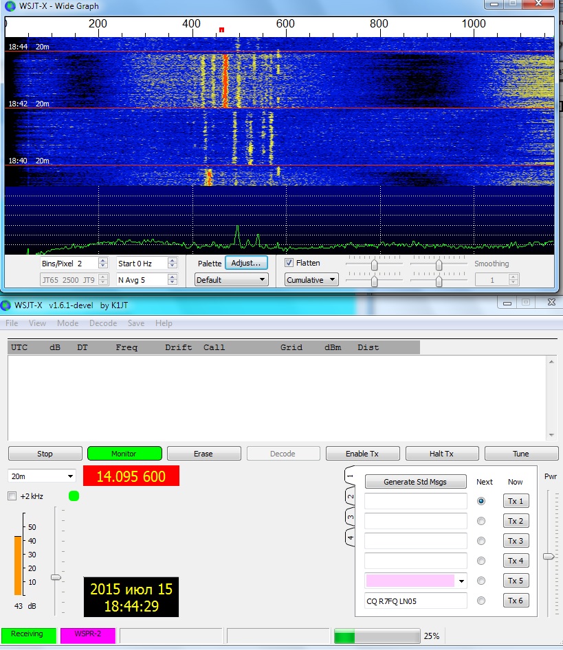 Сегодня в моде WSPR-2 принял 4 станции в участке 13 Гц. Две из них с разносом всего 1 Гц.