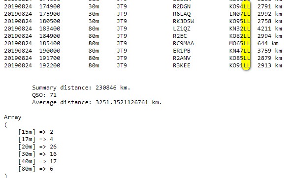 Сергей дело в том что передают от локатора только 4 знака ,нет конечных буковок .А так конечно если все предавали ?то и общее количество км было бы за 150 тыс .Ну что есть то есть .Собственно тоже согласен ,что есть не равенство между континентами и место положением ,работал только на 20 м и несколько связей на 14 м, ниже 20 м антенн нет ,причина - проблема с домом,крыша металлическая ,во дворе не натянешь ,стоят одни иномарки ,рядом оживленный перекресток ,короче со всех сторон засада .