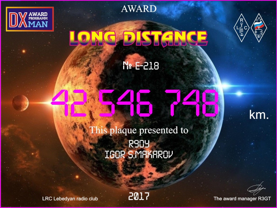 Интересен диплом по расстоянию в км. Это за 5 лет в эфире.... у других за 50 лет и более ???? У меня 42 546 748 км за 5 лет!