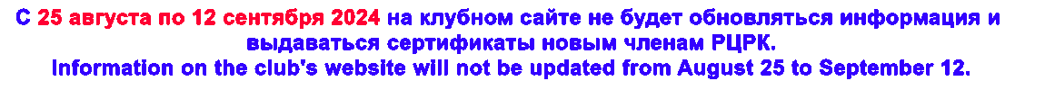 С 25 августа по 12 сентября 2024 на клубном сайте не будет обновляться информация и выдаваться сертификаты новым членам РЦРК.