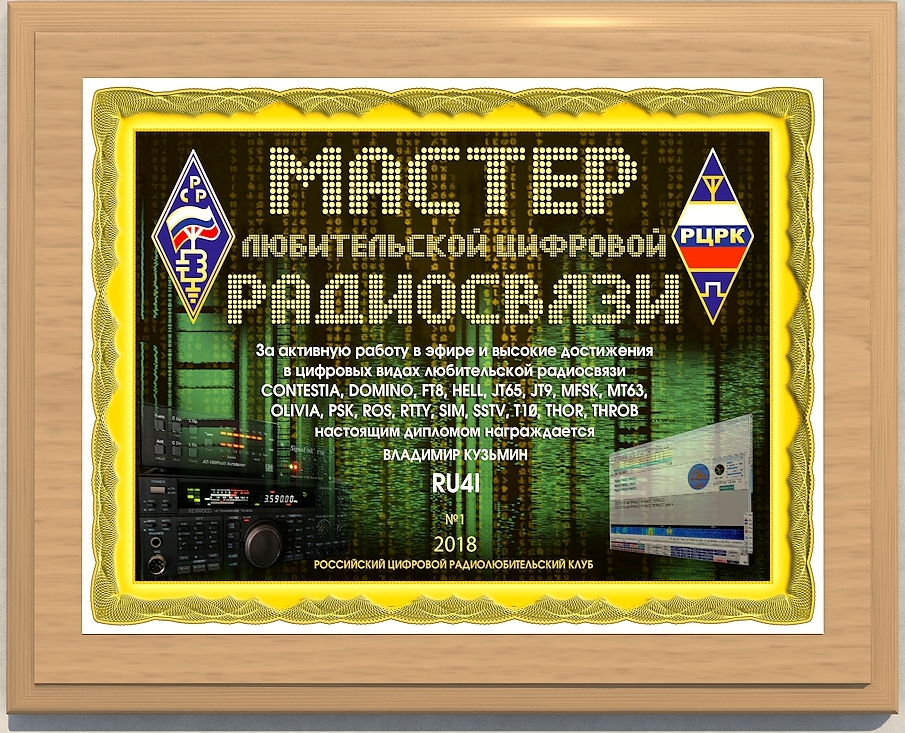 Диплом «Мастер любительской цифровой радиосвязи» учреждён клубом РЦРК с целью поощрения радиолюбителей за активную работу в эфире в течение календарного года 17-ю видами цифровой радиосвязи: 1)CONTESTIA, 2)DOMINO, 3)FT8 4)HELL, 5)JT65, 6)JT9, 7)MFSK, 8)MT63, 9)OLIVIA, 10)PSK, 11)ROS, 12)RTTY, 13)SIM, 14)SSTV, 15)T10, 16)THOR, 17)THROB. За достижения в каждом календарном году, начиная с 2017, будет выдаваться отдельный диплом со своей нумерацией. Таким образом, соискатели имеют возможность ежегодно выполнять норматив МАСТЕРА и получать отдельный диплом за определённый календарный год...