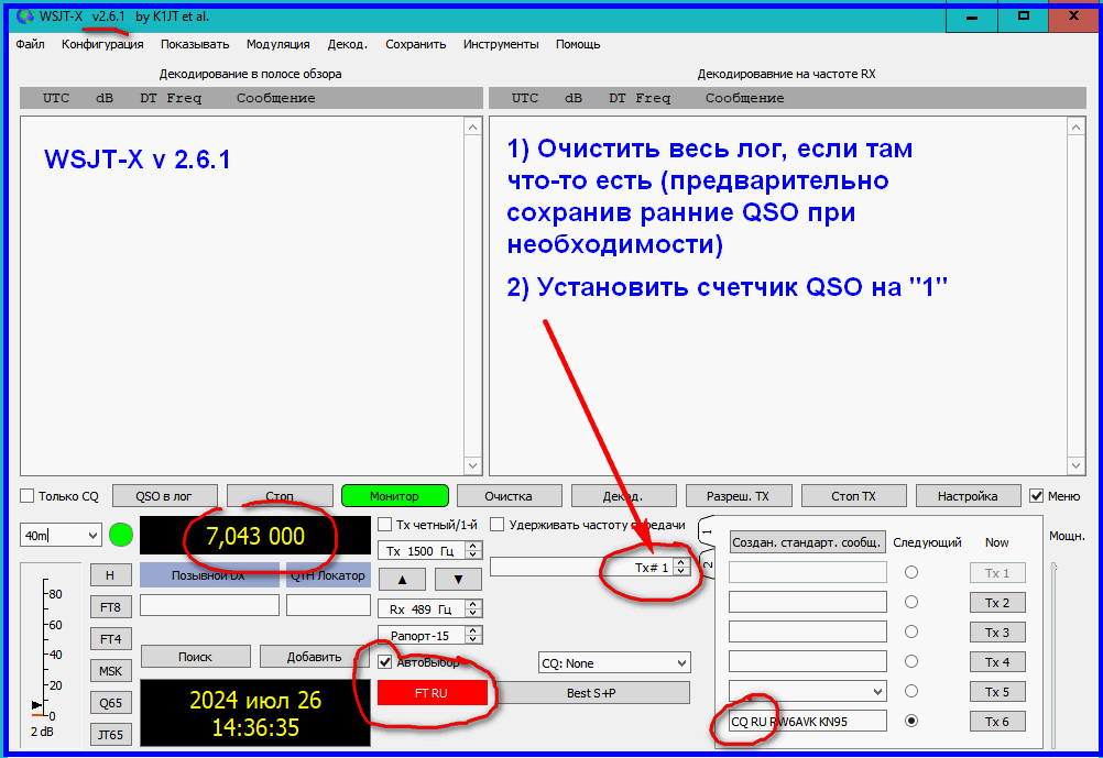 - в окошке "CQ" менять RU на FT? (На сайте: "CQ RU (в программе WSJT-X)"