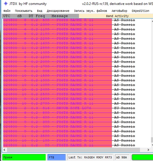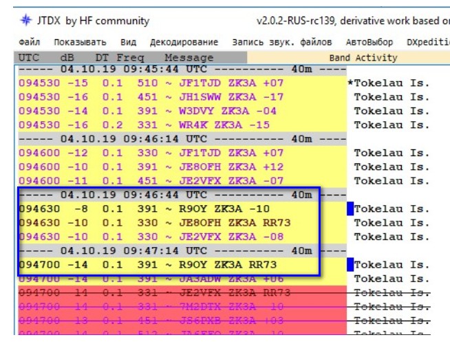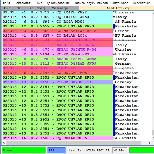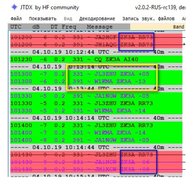 Красный цвет и зачёркнут = сработан позывной. Посмотри позывной ниже, он красный, связь была. Скрин сверху. Почему он зелёный? Хотя сверху и снизу он красный? Что это такое? Проблемы с программой? Почему ZK3A отвечает сразу на двух частотах? Работают два трансивера одновременно?