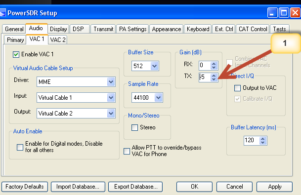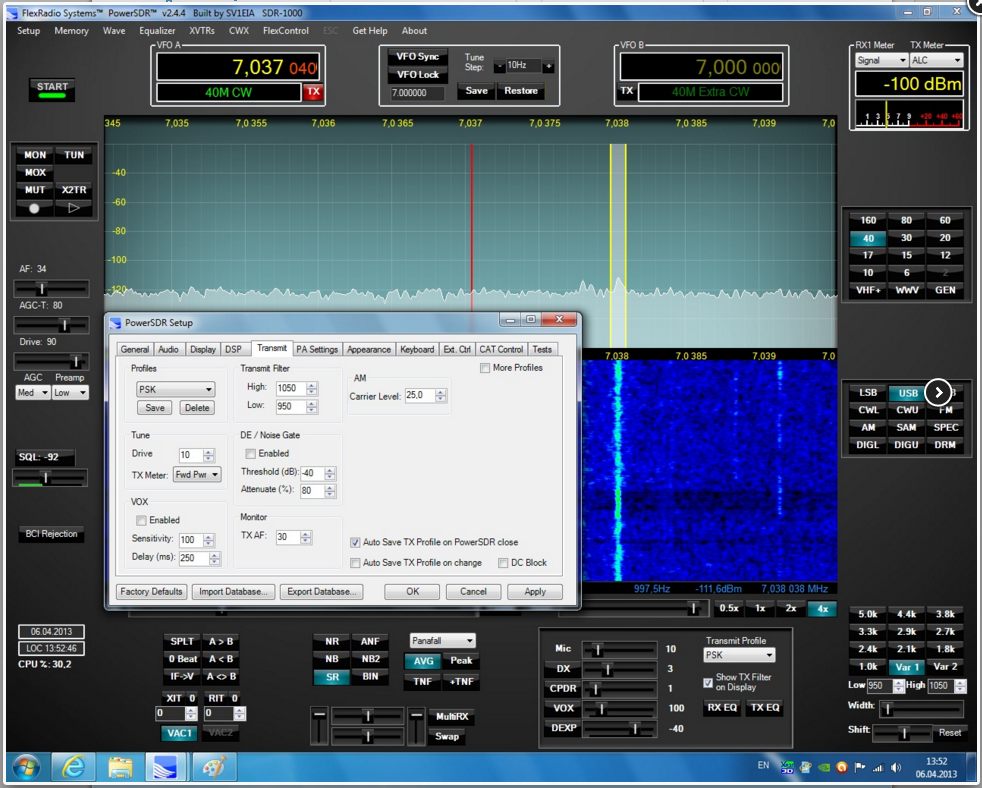Настройки в PowerSDR, выставляется усиление НЧ и контролируется нч сигнал: