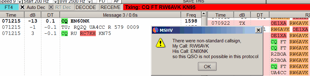 Контрольный номер состоит из RST и порядкового номера QSO, начиная с 0001. Общий вызов CQ FT (в программе MSHV и новых версиях WSJT-X) или CQ RU (в старых версиях WSJT-X).